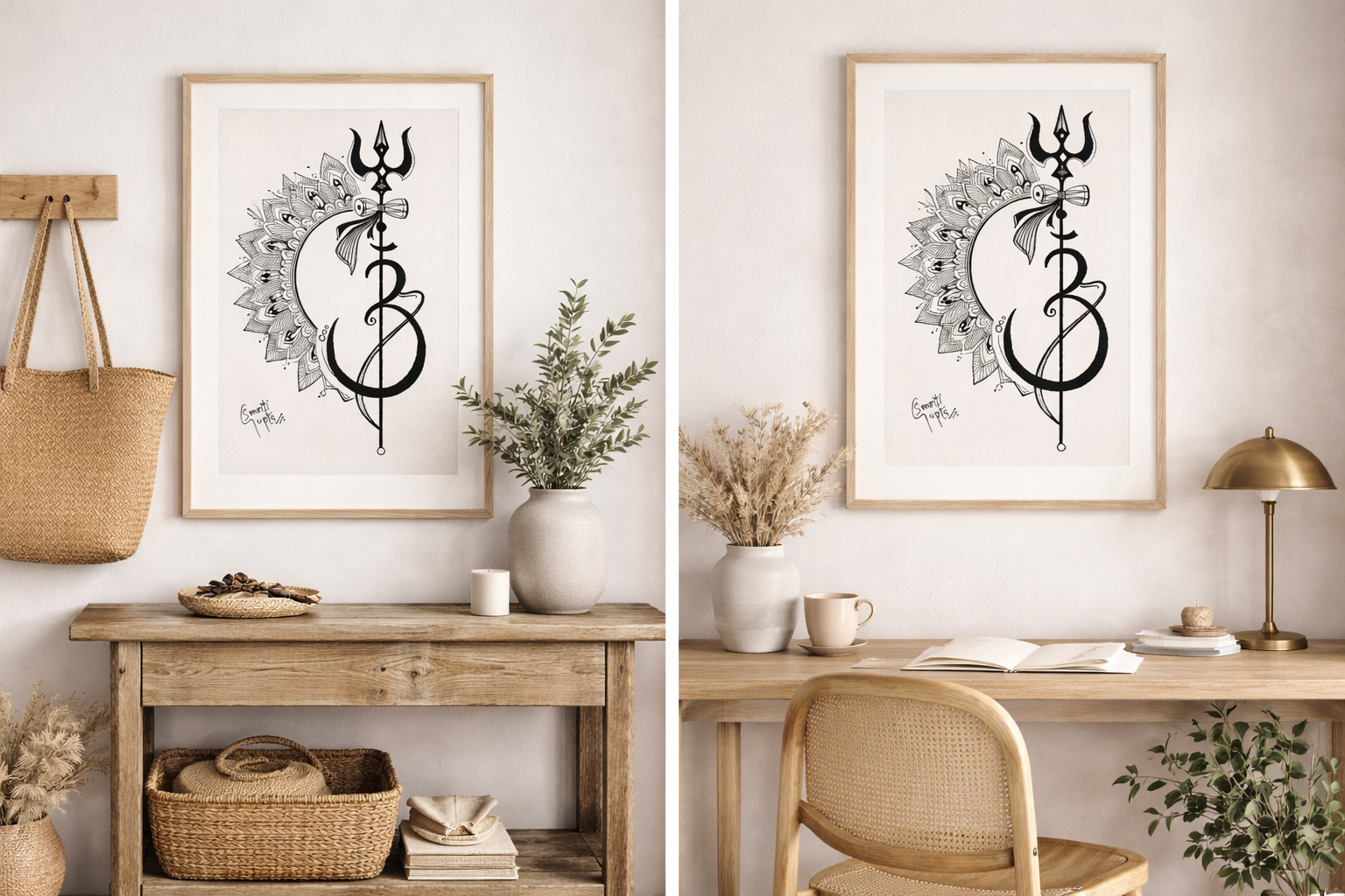 & Free ShippingHand-drawn divinity. A fusion of the sacred sound of the universe and the power of the trident, framed by intricate mandala patterns. A unique addition to your spiritual art collection.
