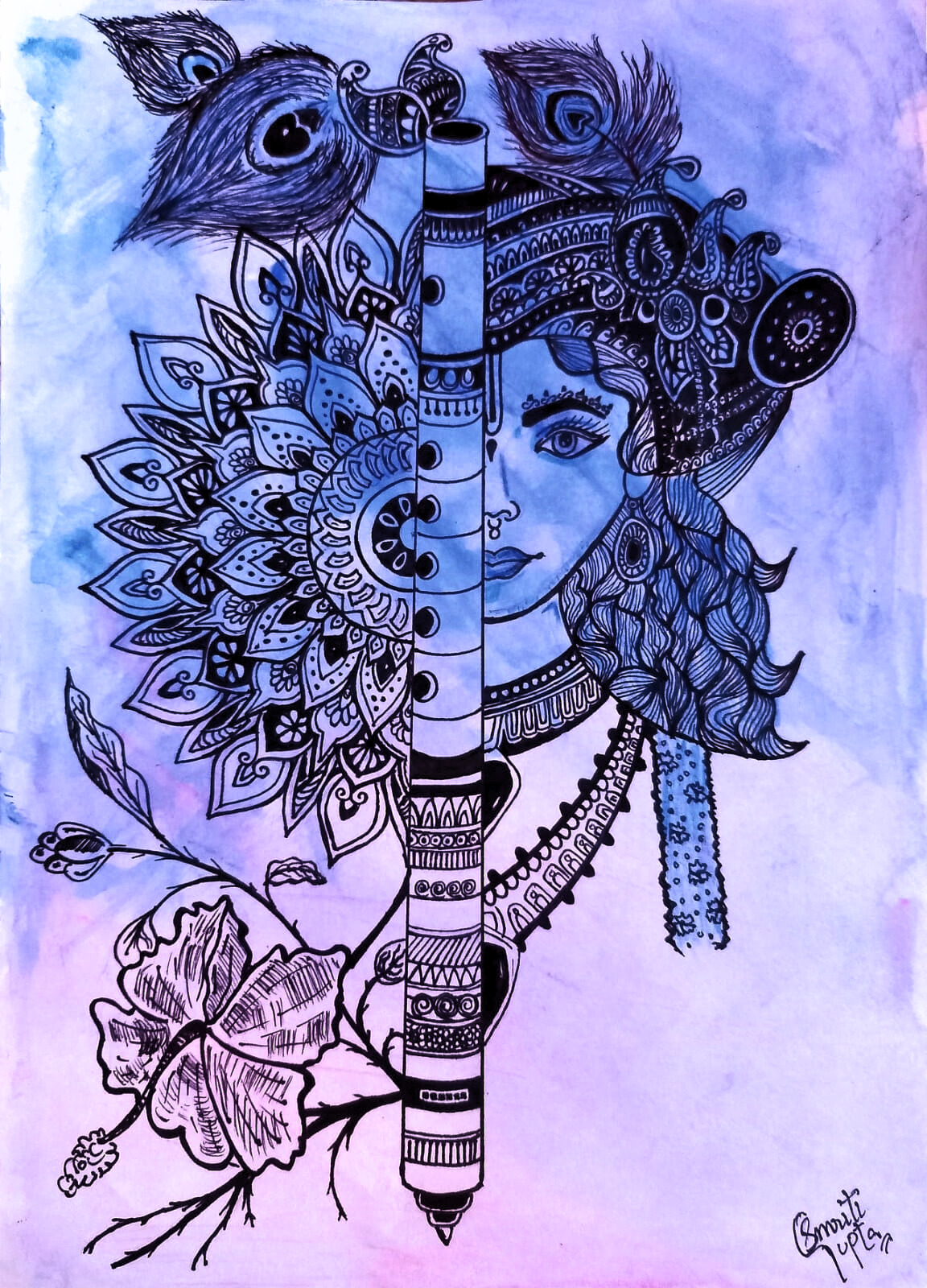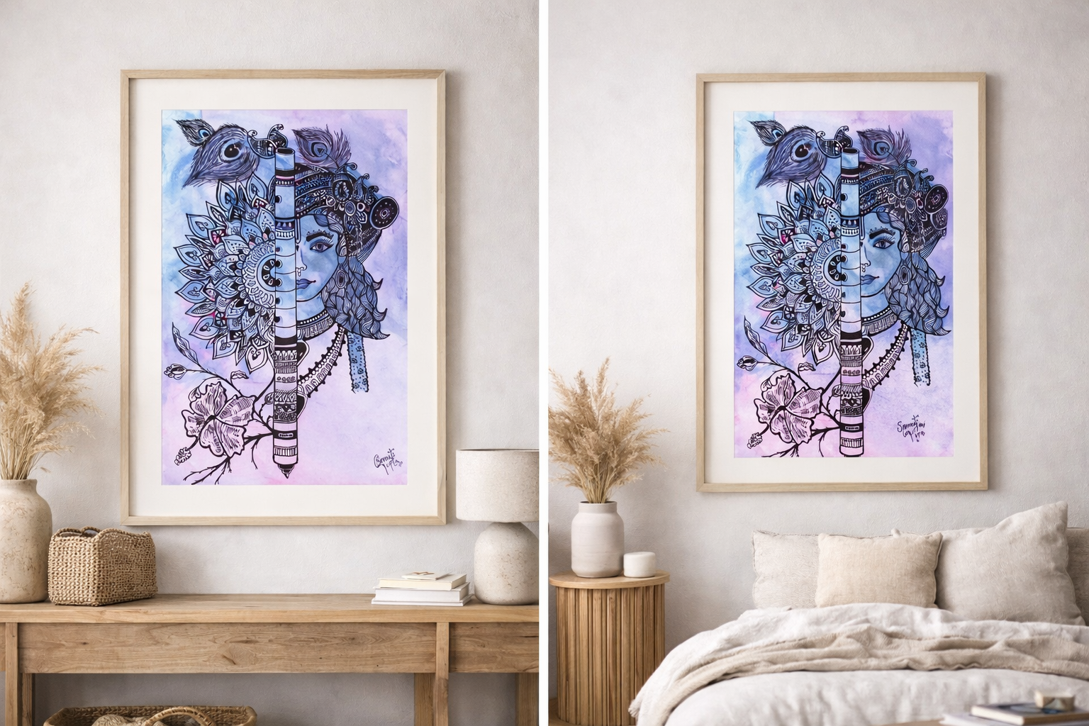A soulful fusion of traditional divinity and intricate geometry. This hand-drawn piece features a detailed mandala blooming from the silhouette of Lord Krishna, symbolizing the harmony between the universe and the divine. Set against a soft, celestial watercolor backdrop, it is designed to bring a sense of peace and mindfulness to any space.